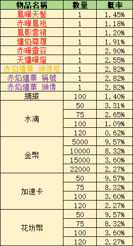 其中【赤焰燼華】的概率加入了保底機制,隨著抽取未中的次數逐漸增大,最終期望值仍為以上表格公示之值,10次必出時裝部件。