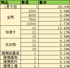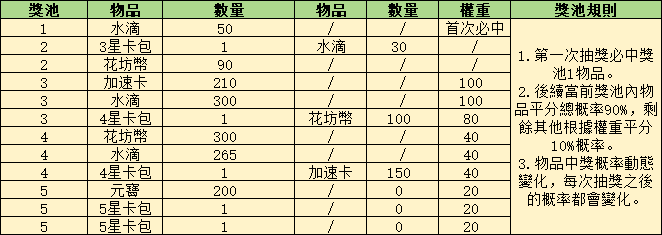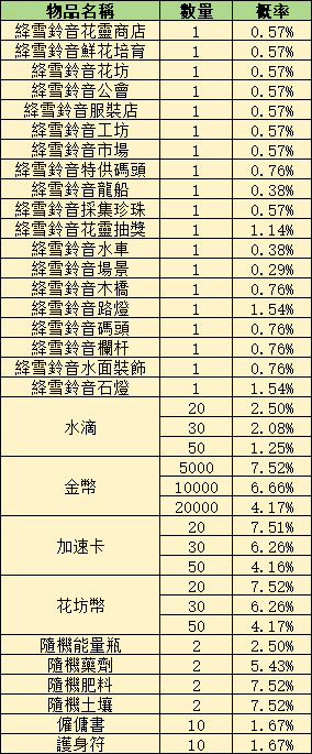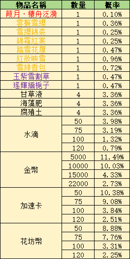 你們在花園裡澆水、培育、收穫的每一刻,都藏著對驚喜的小小期待。為了讓這份期待更明朗,我們已整理好遊戲內各項活動的機率明細,具體詳情請見下方公佈表格~